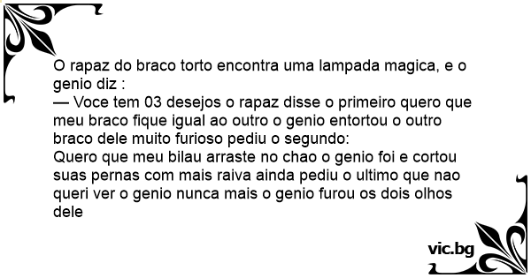— Voce tem 03 desejos o rapaz disse o primeiro quero que meu braco fique igual ao outro o genio entortou o outro braco dele muito furioso pediu o segundo: