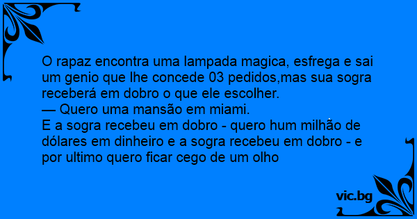 E a sogra recebeu em dobro - quero hum milhão de dólares em dinheiro e a sogra recebeu em dobro - e por ultimo quero ficar cego de um olho