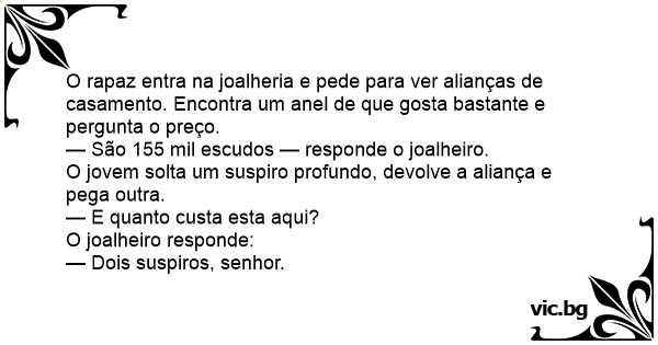 O rapaz entra na joalheria e pede para ver alianças de casamento. Encontra um anel de que gosta bastante e pergunta o preço.