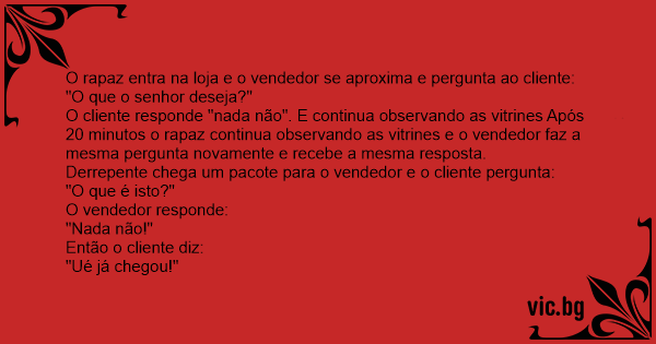 O cliente responde "nada não". E continua observando as vitrines Após 20 minutos o rapaz continua observando as vitrines e o vendedor faz a mesma pergunta novamente e recebe a mesma resposta.