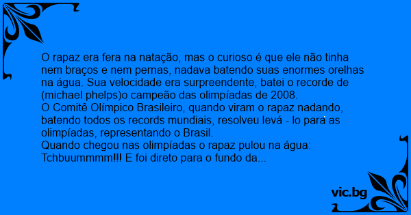 O rapaz era fera na natação, mas o curioso é que ele não tinha nem braços e nem pernas, nadava batendo suas enormes orelhas na água. Sua velocidade era surpreendente, batei o recorde de (michael phelps)o campeão das olimpíadas de 2008.