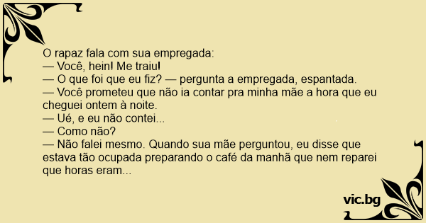 — Você prometeu que não ia contar pra minha mãe a hоrа que eu cheguei ontem à noite.