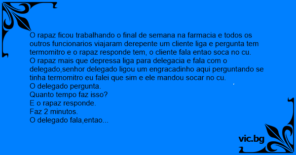 O rapaz ficou trabalhando o final de semana na farmacia e todos os outros funcionarios viajaram derepente um cliente liga e pergunta tem termomitro e o rapaz responde tem, o cliente fala entao soca no cu.