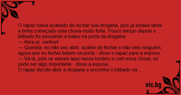 O rapaz havia acabado de fechar sua drogaria, pois já estava tarde e tinha começado uma chuva muito forte. Pouco tempo depois o bêbado foi passando e bateu na porta da drogaria: