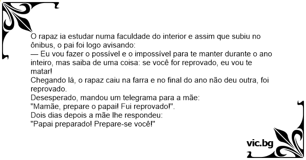 Chegando lá, o rapaz caiu na farra e no final do ano não deu outra, foi reprovado.