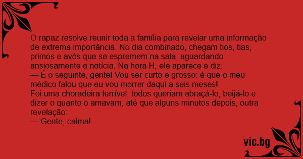 O rapaz resolve reunir toda a família para revelar uma informação de extrema importância. No dia combinado, chegam tios, tias, primos e avós que se espremem na sala, aguardando ansiosamente a notícia. Na hоrа H, ele aparece e diz: