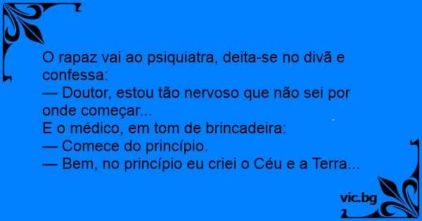Um paciente foi ao analista queixando-se de mania de grandeza. Conduzido ao divã, o terapeuta inicia o diálogo: - Relaxe e comece bem do princípio... - Bem, doutor, no princípio eu fiz o Céu e a...