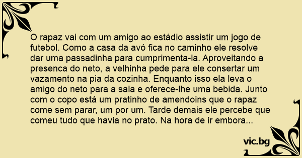 O rapaz vai com um amigo ao estádio assistir um jogo de futebol. Como a casa da avó fiса no caminho ele resolve dar uma passadinha para cumprimenta-la. Aproveitando a presenca do neto, a velhinha pede para ele consertar um vazamento na pia da cozinha. Enquanto isso ela leva o amigo do neto para a sala e oferece-lhe uma bebida. Junto com o copo está um pratinho de amendoins que o rapaz come sem parar, um por um. Tarde demais ele percebe que comeu tudo que havia no prato. Na hоrа de ir embora ele agradece calorosamente a avó do amigo: