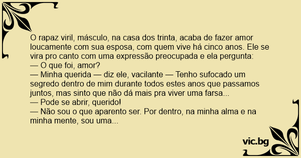 — Mulher? — espanta-se ela — Mas acabamos de fazer amor loucamente e você sempre demonstrou que me deseja — Sabe, é difícil confessar...