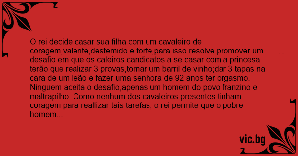 O rei decide casar sua filha com um cavaleiro de coragem,valente,destemido e forte,para isso resolve promover um desafio em que os caleiros candidatos a se casar com a princesa terão que realizar 3 provas,tomar um barril de vinho;dar 3 tapas na cara de um leão e fazer uma senhora de 92 anos ter orgasmo.