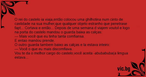 O rei do castelo ia viaja,então colocou uma ghilhotina num cinto de castidade na sua mulher,que qualquer objeto estranho que penetrase fapt... Cortava e então... Depois de uma semana d viajem voutol e logo na porta do castelo mandou o guarda baixa as calças: