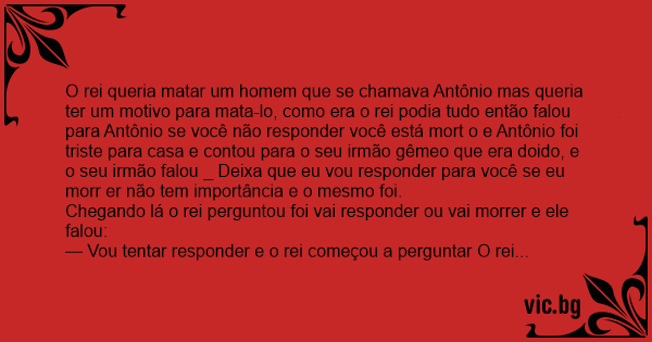 O rei queria matar um homem que se chamava Antônio mas queria ter um motivo para mata-lo, como era o rei podia tudo então falou para Antônio se você não responder você está mort o e Antônio foi triste para casa e contou para o seu irmão gêmeo que era doido, e o seu irmão falou _ Deixa que eu vou responder para você se eu morr er não tem importância e o mesmo foi.