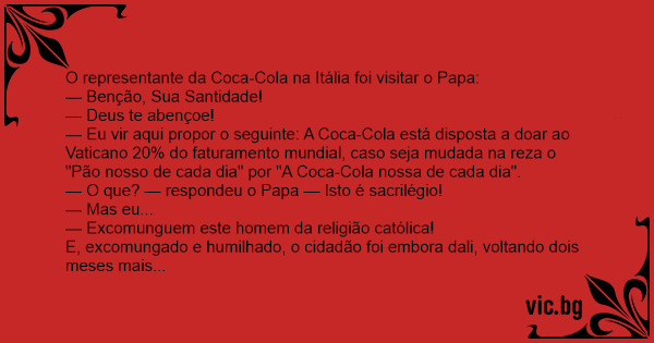 — Sua Santidade, vou direto ao assunto: eu quero a comunhão de volta, e a Coca-Cola oferece 80% do faturamento mundial para que o "Pão nosso" seja mudado para a "Coca-Cola nossa".
