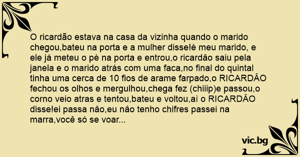 O ricardão estava na casa da vizinha quando o marido chegou,bateu na porta e a mulher disse!è meu marido, e ele já meteu o pè na porta e entrou,o ricardâo saiu pela janela e o marido atrás com uma faca,no final do quintal tinha uma cerca de 10 fios de arame farpado,o RICARDÂO fechou os olhos e mergulhou,chega fez (chiiip)e passou,o соrnо veio atras e tentou,bateu e voltou,aì o RICARDÂO disse!ei passa nâo,eu nâo tenho chifres passei na marra,você só se voar...