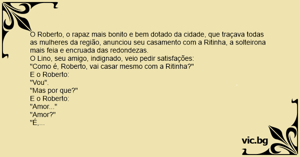 O Roberto, o rapaz mais bonito e bem dotado da cidade, que traçava todas as mulheres da região, anunciou seu casamento com a Ritinha, a solteirona mais feia e encruada das redondezas.