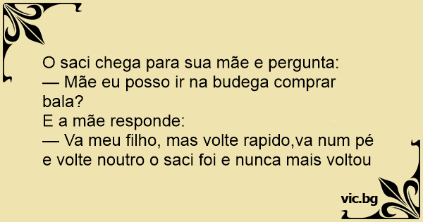 — Va meu filho, mas volte rapido,va num pé e volte noutro o saci foi e nunca mais voltou