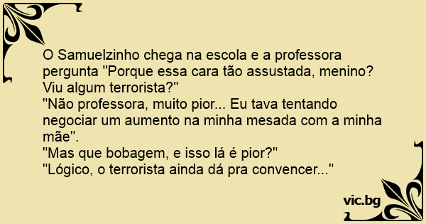 O Samuelzinho chega na escola e a professora pergunta "Porque essa cara tão assustada, menino?