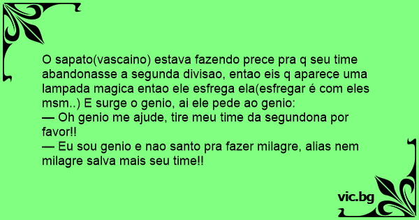 O sapato(vascaino) estava fazendo prece pra q seu time abandonasse a segunda divisao, entao eis q aparece uma lampada magica entao ele esfrega ela(esfregar é com eles msm..) E surge o genio, ai ele pede ao genio:
