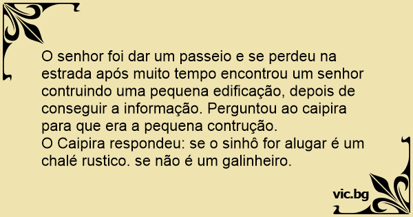 O Caipira respondeu: se o sinhô for alugar é um chalé rustico. se não é um galinheiro.