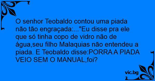 O senhor Teobaldo contou uma piada não tão engraçada:..."Eu disse pra ele que só tinha copo de vidro não de água,seu filho Malaquias não entendeu a piada. E Teobaldo disse:РОRRА A PIADA VEIO SEM O MANUAL,foi?