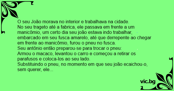 Substituindo o pneu, no momento em que seu joão ecaichou-o, sem querer, ele esbarrou com o pé nos parafusos jogando-os no fundo de um esgoto que ficara ali ao lado. Apavorado, seu joão começou a ficar nervoso e andar de um lado para o outro, não sabendo oque fazer, foi quando notou que sobre o muro do manicômio, estava um louco a lhe observar atentamente, e soltando gargalhadas sem parar e chamando o seu joão de "mané"....
