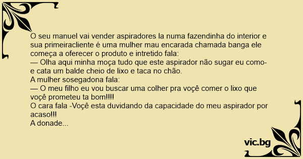 O seu manuel vai vender aspiradores la numa fazendinha do interior e sua primeiracliente é uma mulher mau encarada chamada banga ele começa a oferecer o produto e intretido fala: