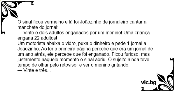 Um motorista abaixa o vidro, puxa o dinheiro e pede 1 jornal a Joãozinho. Ao ler a primeira página percebe que era um jornal de um ano atrás, ele percebe que foi enganado. Ficou furioso, mas justamente naquele momento o sinal abriu. O sujeito ainda teve tempo de olhar pelo retovisor e ver o menino gritando: