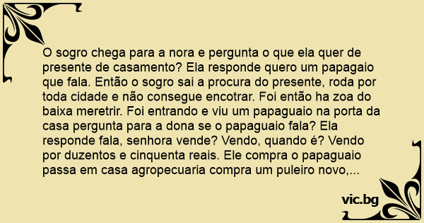 O sogro chega para a nora e pergunta o que ela quer de presente de casamento? Ela responde quero um papagaio que fala. Então o sogro sai a procura do presente, roda por toda cidade e não consegue encotrar. Foi então ha zoa do baixa meretrir. Foi entrando e viu um papaguaio na porta da casa pergunta para a dona se o papaguaio fala? Ela responde fala, senhora vende? Vendo, quando é? Vendo por duzentos e cinquenta reais. Ele compra o papaguaio passa em casa agropecuaria compra um puleiro novo, suas vazililhas e o leva paraq casa. O papaguaio só comia e dormia. No dia do casamento ele o levou para igreija, os convidados perguntava para ele se o papaguaio falava, ele respondia fala mais nada falar, então entra a nova na igreja e a mancha nupisial tocando e aquele alvoroço na igreja. O papaguaio começou a falar chave é 10, вuсета é 20 e cu é 30 quando mais se falava mais alto ele repetia. O sogro arancou o revolver da cintura e meteu bala para o lado do papaguaio, ele desvio-se das bala e disse não esquenta pessoal e tiro aqui outro acular zona é assim mesmo.