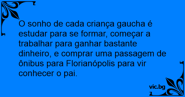 O sonho de cada criança gaucha é estudar para se formar, começar a trabalhar para ganhar bastante dinheiro, e comprar uma passagem de ônibus para Florianópolis para vir conhecer o pai.