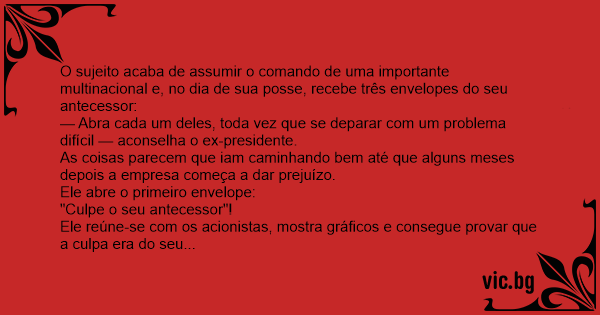 O sujeito acaba de assumir o comando de uma importante multinacional e, no dia de sua posse, recebe três envelopes do seu antecessor: