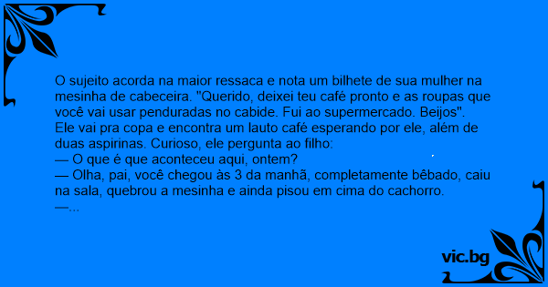 O sujeito acorda na maior ressaca e nota um bilhete de sua mulher na mesinha de cabeceira. "Querido, deixei teu café pronto e as roupas que você vai usar penduradas no cabide. Fui ao supermercado. Beijos".