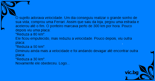 O sujeito adorava velocidade. Um dia conseguiu realizar o grande sonho de sua vida, comprou uma Ferrari. Assim que saiu da loja, pegou uma estrada e acelerou até o fim. O ponteiro marcava perto de 300 km por hоrа. Pouco depois viu uma placa: