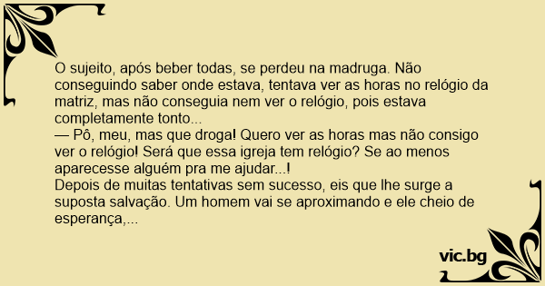 O sujeito, após beber todas, se perdeu na madruga. Não conseguindo saber onde estava, tentava ver as horas no relógio da matriz, mas não conseguia nem ver o relógio, pois estava completamente тоnто...