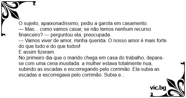 No primeiro dia que o marido chega em casa do trabalho, depara-se com uma cena inusitada: a mulher estava totalmente nua, subindo as escadas e escorregando pelo corrimão. Ela subia as escadas e escorregava pelo corrimão. Subia e escorregava...