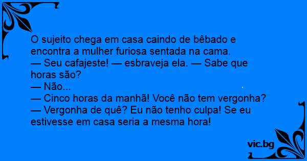 — Seu cafajeste! — esbraveja ela. — Sabe que horas são?
