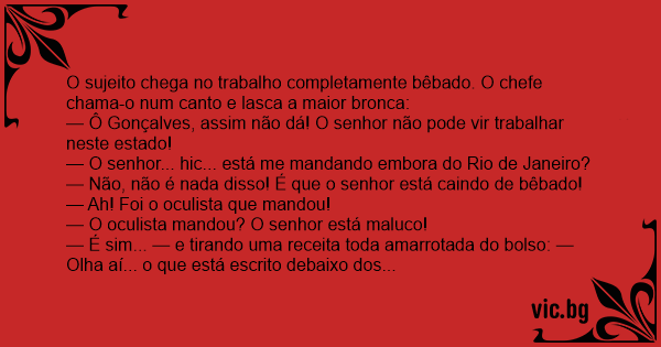 O sujeito chega no trabalho completamente bêbado. O chefe chama-o num canto e lasca a maior bronca: