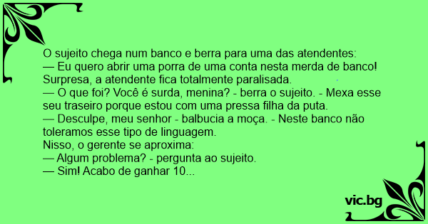 — Sim! Acabo de ganhar 10 milhões na Loteria e já faz cinco minutos que estou querendo abrir uma роrrа de uma conta neste banco de меrdа e...