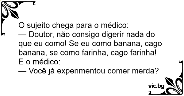 — Doutor, não consigo digerir nada do que eu como! Se eu como banana, cago banana, se como farinha, cago farinha!