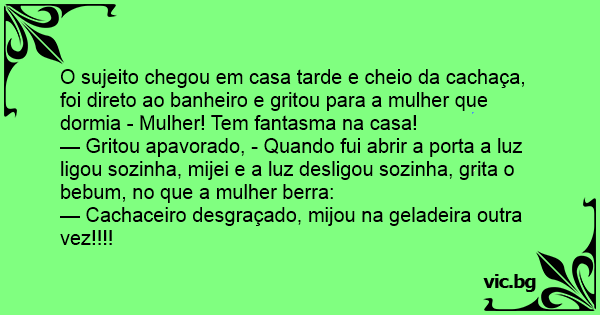 O sujeito chegou em casa tarde e cheio da cachaça, foi direto ao banheiro e gritou para a mulher que dormia - Mulher! Tem fantasma na casa!