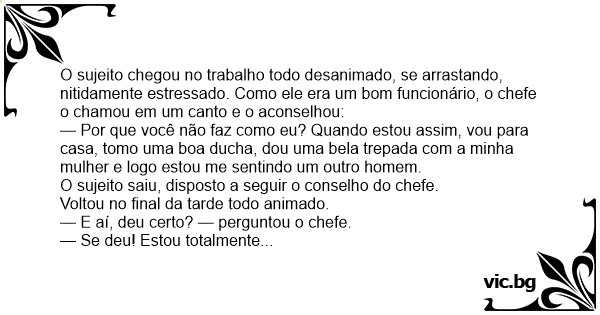— Por que você não faz como eu? Quando estou assim, vou para casa, tomo uma boa ducha, dou uma bela trepada com a minha mulher e logo estou me sentindo um outro homem.