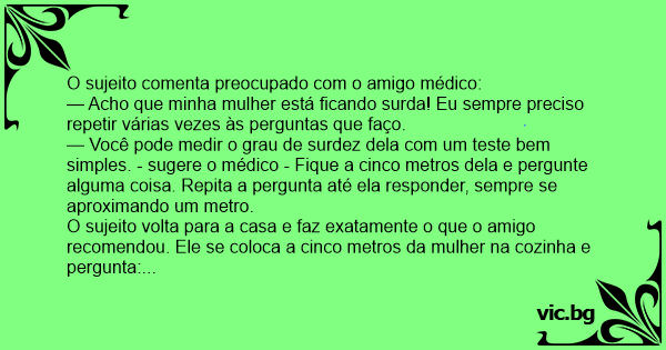 O sujeito volta para a casa e faz exatamente o que o amigo recomendou. Ele se coloca a cinco metros da mulher na cozinha e pergunta: