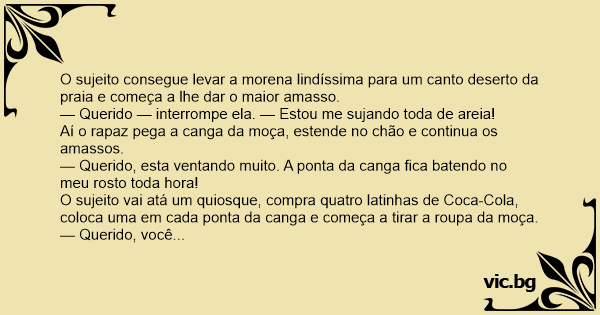 O sujeito vai atá um quiosque, compra quatro latinhas de Coca-Cola, coloca uma em cada ponta da canga e começa a tirar a roupa da moça.
