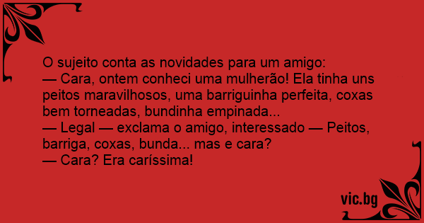 — Cara, ontem conheci uma mulherão! Ela tinha uns peitos maravilhosos, uma barriguinha perfeita, coxas bem torneadas, bundinha empinada...