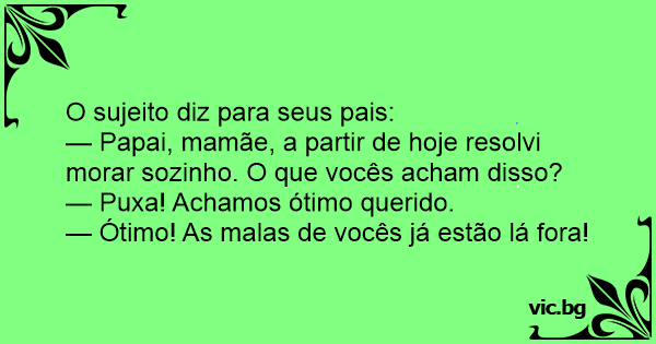 - Mamãe, papai, a partir de hoje quero morar sozinha. O que acham? - Puxa, minha filha, achamos ótimo! - Que bom... Suas malas já estão lá fora!