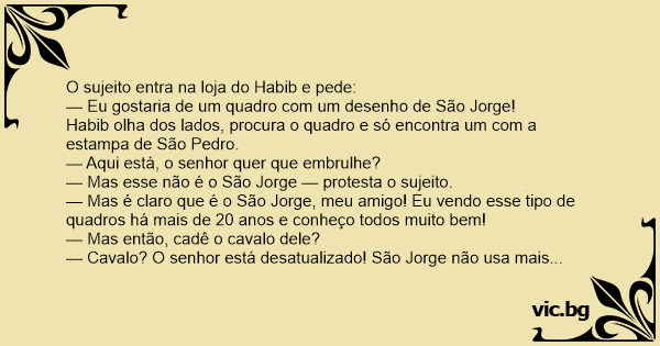 — Mas é claro que é o São Jorge, meu amigo! Eu vendo esse tipo de quadros há mais de 20 anos e conheço todos muito bem!