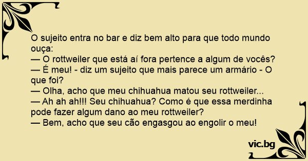 — Ah ah ah!!! Seu chihuahua? Como é que essa merdinha pode fazer algum dano ao meu rottweiler?