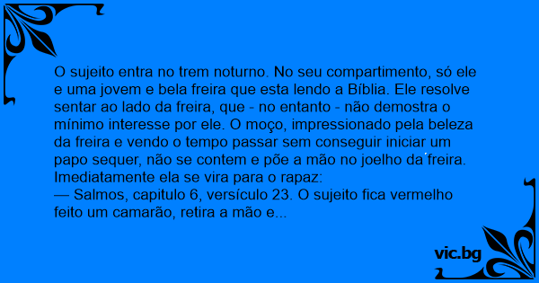 — Salmos, capitulo 6, versículo 23. O sujeito fiса vermelho feito um camarão, retira a mão e não se mexe mais durante o resto da viagem. De volta em casa, ele corre para pegar uma Bíblia e a abre no capitulo 6, versículo 23, onde lê: O Paraíso fiса mais para cima.