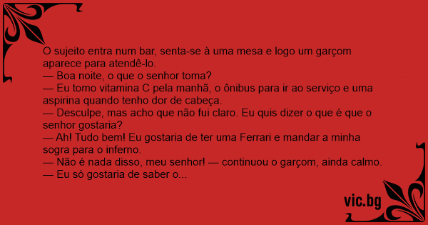 — Boa noite, o que o senhor toma?