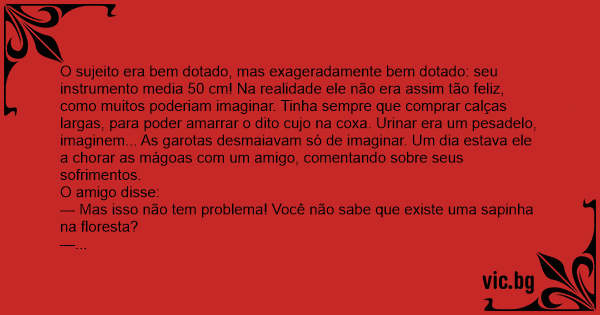 O sujeito era bem dotado, mas exageradamente bem dotado: seu instrumento media 50 cm! Na realidade ele não era assim tão feliz, como muitos poderiam imaginar. Tinha sempre que comprar calças largas, para poder amarrar o dito cujo na coxa. Urinar era um pesadelo, imaginem... As garotas desmaiavam só de imaginar. Um dia estava ele a chorar as mágoas com um amigo, comentando sobre seus sofrimentos.