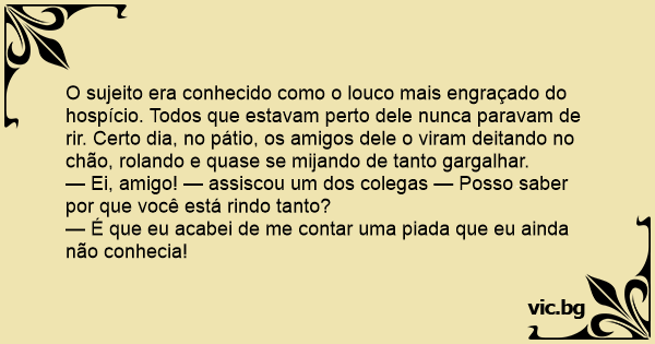 O sujeito era conhecido como o louco mais engraçado do hospício. Todos que estavam perto dele nunca paravam de rir. Certo dia, no pátio, os amigos dele o viram deitando no chão, rolando e quase se mijando de tanto gargalhar.